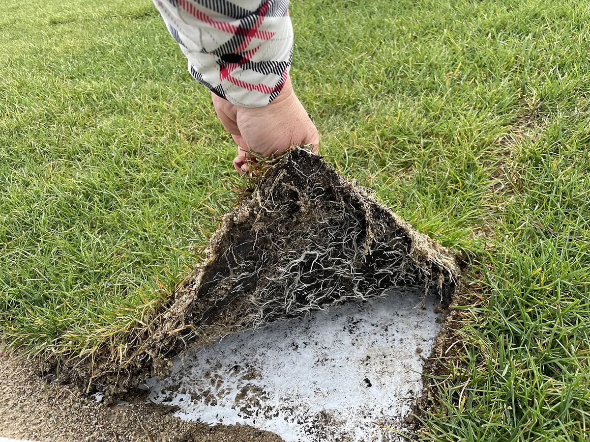 “Real Grass, Real Fast” is sod that is grown on an impervious surface. The roots are forced to grow laterally instead of down, creating a dense root mat. The sod is grown in a two-inch 80/20 sand/peat ratio profile, which is ideal for drainage and stability. It weighs 15-20 pounds per square foot, so when a roll that is 3.5 feet wide by 40 feet long is laid down, even a 300-pound lineman digging in against an opponent won’t budge it. The massive root mat remains intact when harvested and transplanted. Unlike traditional sod, there is no need to separate the grass from soil, so there is no root shearing which minimizes transplant shock as well as increases the rate that the sod adheres once transplanted. “Real Grass, Real Fast” provides professional field conditions immediately, and is a great long-term solution with healthy roots, aggressive grass varieties, and an ideal soil profile.